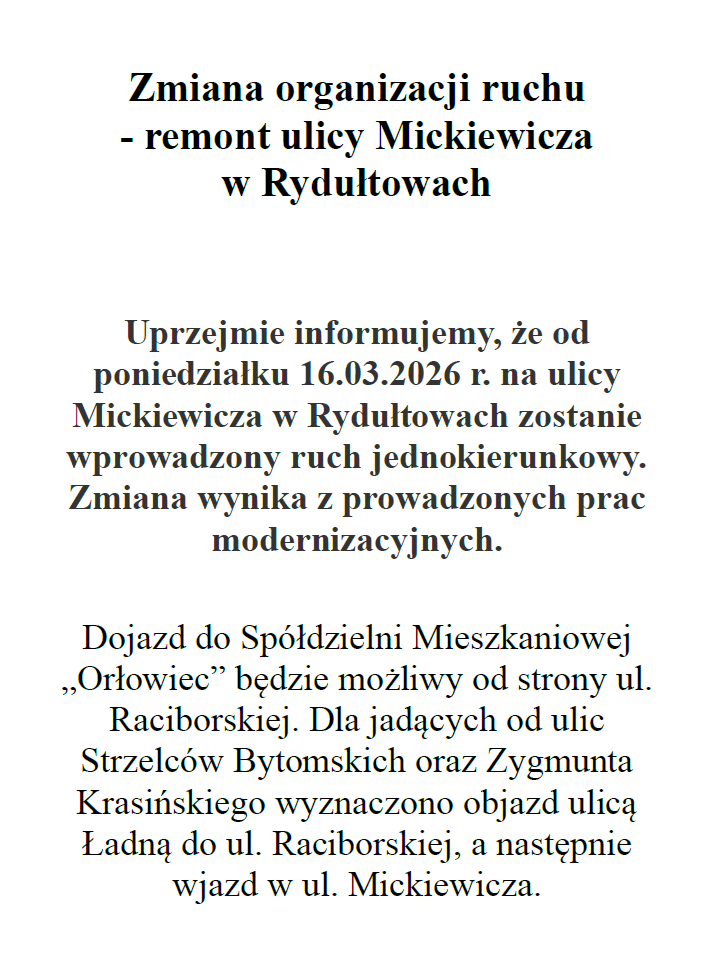 Zmiana organizacji ruchu – remont ulicy Mickiewicza w Rydułtowach – 16.03.2026r